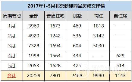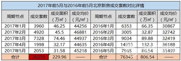 據統計,2017年1-5月,北京新房網簽量僅有20259套,同比去年同期大跌73.46%;成交面積共計229.96萬㎡,同比去年同期下跌71.48%。