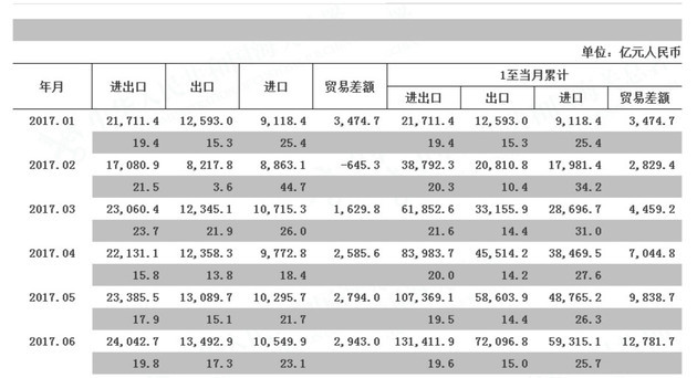 據(jù)海關(guān)統(tǒng)計(jì),今年上半年,我國(guó)貨物貿(mào)易進(jìn)出口總值13.14萬(wàn)億元人民幣,比2016年同期增長(zhǎng)19.6%。其中,出口7.21萬(wàn)億元,增長(zhǎng)15%;進(jìn)口5.93萬(wàn)億元,增長(zhǎng)25.7%;貿(mào)易順差1.28萬(wàn)億元,收窄17.7%。