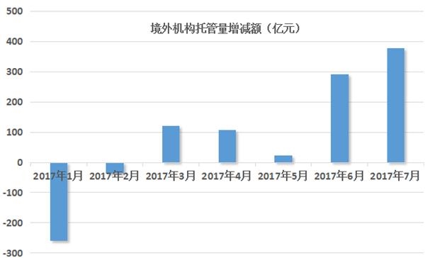 目前上清所還未公布7月債券托管數(shù)據(jù)。該所是銀行間非金融企業(yè)信用債的主要存管機(jī)構(gòu)。但上清所此前數(shù)據(jù)顯示,6月份境外機(jī)構(gòu)債券托管量為388.23億元,創(chuàng)了2016年1月以來新高,并已連續(xù)四個(gè)月增加。