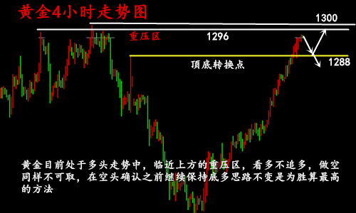 對于本周這種單邊上漲行情,相信出乎大多數(shù)的人的意料,尤其對于這種只漲不回調(diào)的走勢,更加讓人看不明白,讓一部分人處于做多怕見頂,做空怕繼續(xù)沖高的尷尬境地。結(jié)果只能眼睜睜著看著行情一步步走到1290上方,一步步的錯過。析妍此前也是把90作為一個前期的壓力位看待,不破就不打算去追多,不想冒著觸頂?shù)娘L(fēng)險去趕著操作,而昨日在亞盤階段多頭就絲毫不回頭的繼續(xù)上沖,沖破1290的重壓位,而析妍也是不猶豫,通知在破位后多單進場,析妍常說的一句話,方向出來了就進,先抓住盈利再考慮別的。美盤前,行情再一次回調(diào)低點,很多朋友可能就以為是多頭無力需要回調(diào)抓空,而析妍在文章就說過,只要沒破1288的支撐,我們就是以多頭趨勢為主,多單順利在1294成功止盈,盈利雖然不算多,但是方向?qū)α耍覀儗τ谟仓皇鞘值角軄怼?/span>
