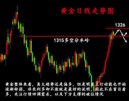 昨日是萬眾矚目的非農,白盤行情略有回調,整體波動不大也是常規的走勢,重點還是晚間的非農,而非農也沒有讓我們失望。數據公布非農大幅利多,可市場卻來了一個過山車,大洗牌,瞬間沖高1322附近,就沒有后續了,反而很快跌到了1313,反復無常,跌倒1313附近后再次反彈1320附近,最終以震蕩收尾,總結一下,本次非農數據出乎意料,低于市場的預期,按理論黃金是要大漲的,不過也只是小幅的拉升一波后出現了下跌,并且出現了新低,這很明顯,行情上漲的動能缺乏,此前上漲的趨勢是時候該緩緩了。