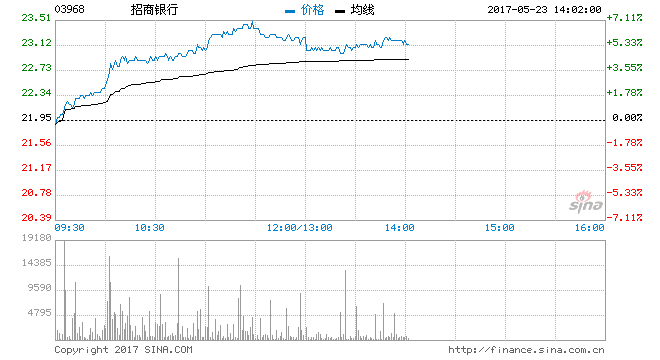 新浪港股訊 5月23日消息,招商銀行(23.1,1.15, 5.24%)今日大漲,領漲內銀,同時領漲中資金融股,漲幅高達7%,股價創(chuàng)2015年6月以來新高,創(chuàng)逾23個逾新高。截止發(fā)稿,招商銀行漲6.83%,報價23.45元。招行A股漲4.69%,報價21.87元,創(chuàng)自2008年1月以來近九年半高。