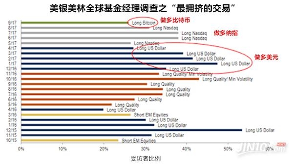 根據美銀美林周二(9月12日)最新公布的每月基金經理調查,在181位管理資金共達5490億美元的受訪者當中,有高達26%的基金經理認為“做多比特幣”是最為擁擠的交易;排在第二位的是“做多納斯達克指數”,年初迄今納指已上漲20%;而認為答案是“做空美元”的受訪者比例則為21%,值得注意的是,直至今年3月份,做多美元一直是最擁擠的交易。