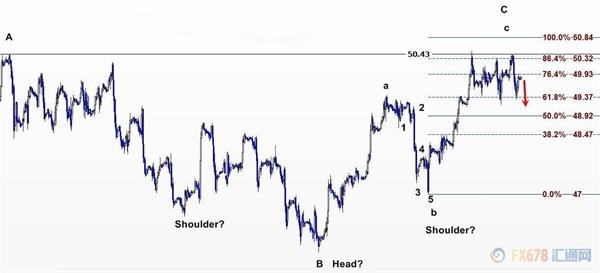 該阻力位是8月1日高位。下一道阻力為50.32美元,即自9月11日低點47美元延伸而來的上升C浪的86.4%費波納奇預(yù)測水準。