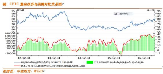 另一方面,基金凈多倉增加。截止2017年5月9日,美棉期貨和期權基金凈多持倉為111529張,折合約245萬噸棉花,處于歷史高位;基金凈多持倉占比37.5%。
