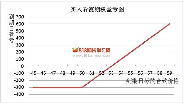 舉例:投資者買入10份權(quán)利金為3元的執(zhí)行價為50元的以A期貨合約為標(biāo)的的一個月到期歐式看漲期權(quán)。一份期權(quán)合約包含10手期貨合約,所以頭寸包括100手期貨合約,初始投資為3*100=300元。若一個月到期日,期貨價格在50元以上,例如55元,則行權(quán)以50元買入期貨合約,盈利為55*100-50*100-300=200元。若在到期日,期貨價格跌到50元以下,則不行權(quán),損失權(quán)利金300元。