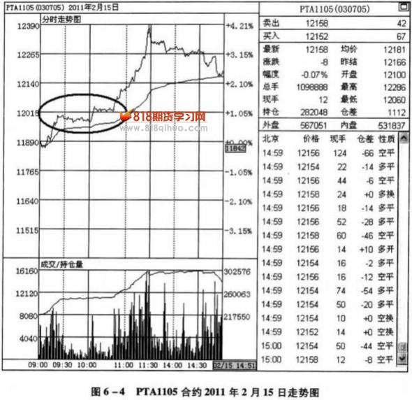 PTA1105合約2011年2月15日開盤之后價格便出現了快速上漲的走勢,在價格早盤期間上漲之后,出現了二次調整的走勢,這兩次調整出現的時候,調整的時間都非常長,對此,投資者戍該如何進行分析呢?這是否意味著多方力度不強呢?