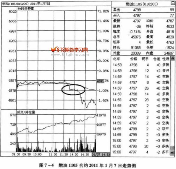 滬鋅1104合約2011年1月7日下午開盤后價(jià)格出現(xiàn)了連續(xù)下跌的走勢(shì),下跌途中反彈多次出現(xiàn),雖然這些反彈會(huì)對(duì)做空的操作產(chǎn)生一些干擾,但每一次反彈卻是一次衡量多空力度的機(jī)會(huì),投資者要善于從反彈走勢(shì)中找到價(jià)格后期波動(dòng)方向的信號(hào)。