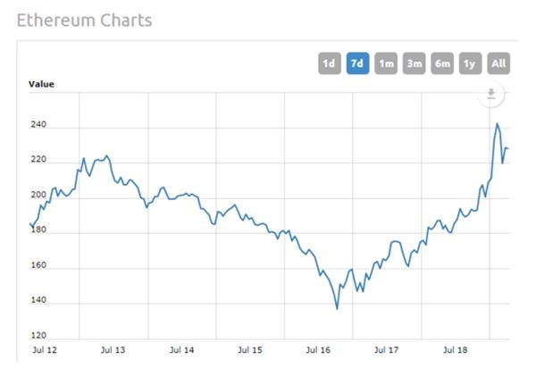 自7月16日到7月18日,以太幣價格深V反轉,一度暴漲80%至242美元,價格幾乎翻倍。
