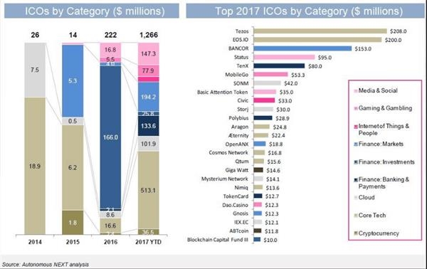 據Autonomous Research數據,今年以來企業經由發行數位貨幣已籌集13億美元,這個金額超過區塊鏈公司獲得的風險投資資金,同時也是去年發行額的六倍多。與以太坊區塊鏈連結的虛擬貨幣以太幣年初ICO時才8美元左右,到了上個月漲到將近400美元。此后下跌約50%。