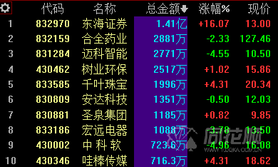 成交額方面,東海證券成交1.41億元,領(lǐng)先創(chuàng)新層企業(yè),共8只創(chuàng)新層個(gè)股成交破千萬(wàn),成交額前十如下圖: