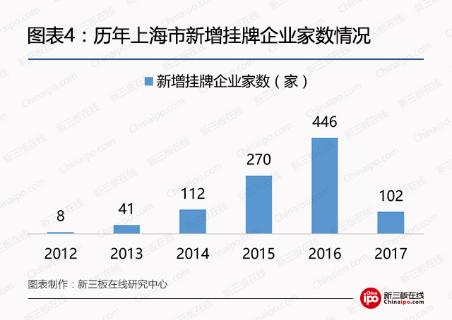 2012年以來,至2016年,上海市新三板企業(yè)的掛牌速度有增無減,2016年上海市新增掛牌新三板企業(yè)達到446家。而截至2017年6月9日,2017年前五個月上海市新增掛牌企業(yè)僅為102家,掛牌速度有所減緩。